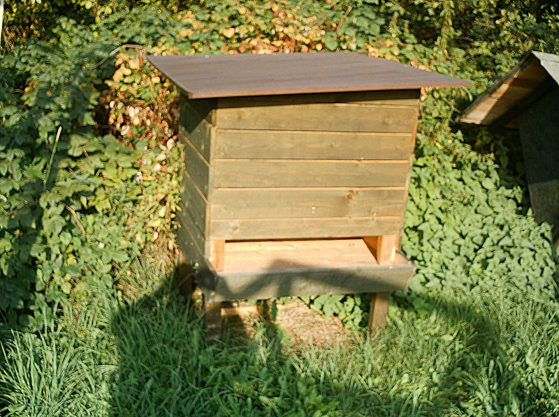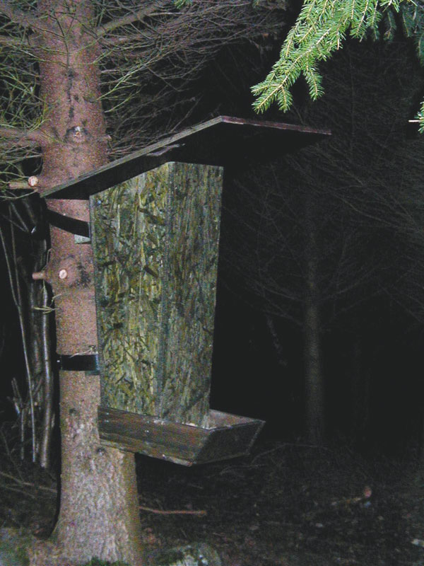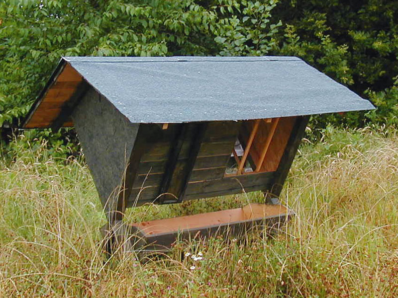 Bei der Fütterung „Westerwald“ handelt es sich um eine Kombination für Rau- und Schüttfutter. Die große Vorratskammer hat ein Fassungsvermögen von ca. 100 kg Schüttfutter. Die Fütterung hat die Abmessungen 1,60 x 1,00 m mit einer Gesamthöhe von 1,75 m. Sie ist wie alle unsere Produkte aus Lärchenholz gefertigt. Das Dach, das mit einer Schweißbahn gut abgedichtet ist, steht weit über und bietet dadurch sicheren Schutz vor Wind und Wetter. Die Fütterung ist komplett einmal in Grün gestrichen.