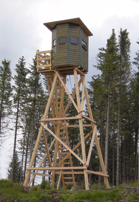 Einen hervorragenden Rundumblick und viel Beinfreiheit bietet die „Panorama-Kanzel I“. Es handelt sich um eine geschlossene Kanzel mit den Außenmaßen 1,20 (+ Vorbau) x 1,50 x 2,00 m und seitlichem Podest mit Geländer 1,20 x 0,80 m. Auch sie hat Fenster aus 5 mm Acrylglas, die in einer speziellen Führung zum Öffnen nach oben geschoben und arretiert werden, und eine Tür mit Fenster. Dazu stehen verschieden hohe Unterbauten, mehrere Leiter- bzw. Treppenvarianten und Zubehör zur Auswahl.