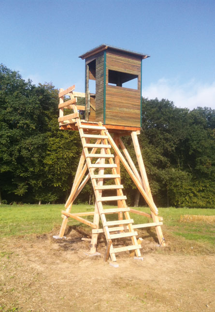 Bei unserem Grundmodell „Stegskopf“ handelt es sich um eine offene Kanzel. Sie hat keine Fenster und keine Tür. Ihre Außenmaße sind 1,20 x 1,20 x 2,00 m mit einem seitlichen Podest 1,20 x 0,80 mit Geländer. Dazu stehen verschieden hohe Unterbauten, mehrere Leiter- bzw. Treppenvarianten und Zubehör zur Auswahl.